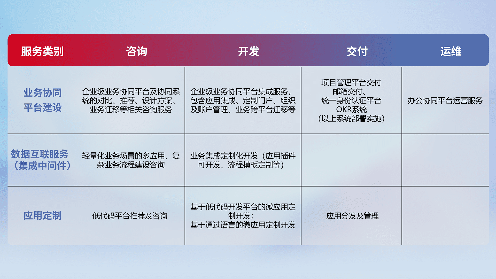 针对钉钉、、、企微、、、、IDaas等平台级产品提供产品的规划、、、、方案、、交付、、、、定制化开发等服务,,,实现如统一协同办公、、、智能客户服务、、、混合会议管理、、智能数据查询、、、、等业务场景,,,实现数字化转型。。
