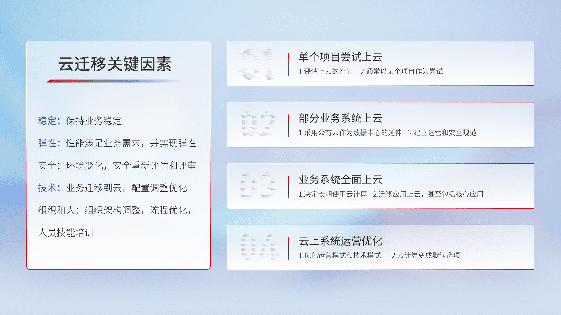 结合实际业务,,从规划设计、、、云平台选型、、、、云原生改造、、数据迁移、、集成交付,,,迁移全过程为客户识别最佳上云路径,,,做好风险识别管理,,,设计网络架构、、、、身份权限、、、、安全审计合规、、、、操作审计、、、、日志审计、、监控告警策略、、多站点容灾设计等,,,对云上基础设施进行整体规划,,提升IT治理水平,,,,以满足弹性、、高可用、、、、高性能的需求。。。。