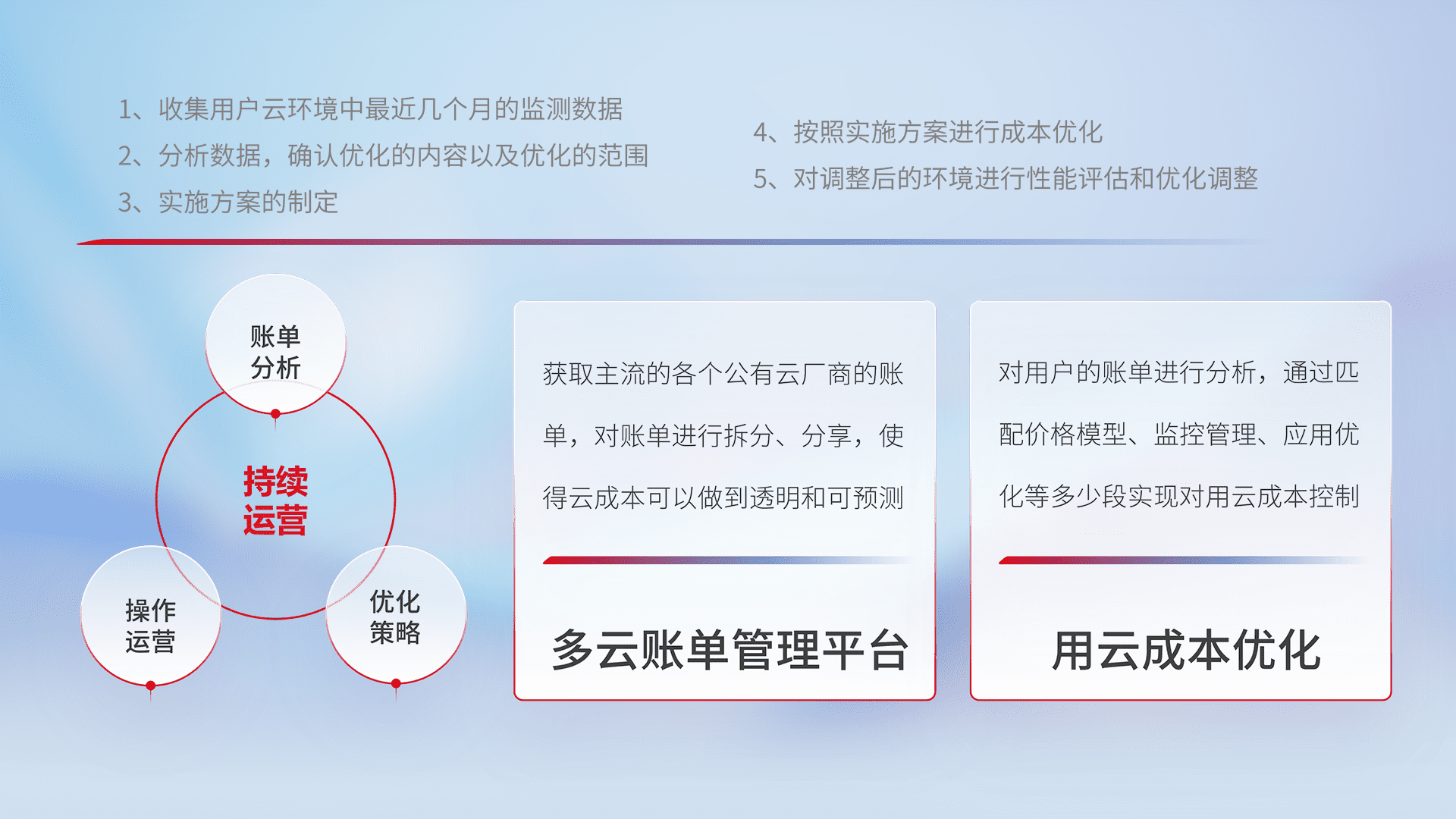 通过多云纳管,,以统一的资源数据模型把客户的云资源进行抽象和封装,,,进而实现对多云资源的统一操作,,,,保障云资源管理的可靠性、、、稳定性与可用性。。量身定制化运维内容,,配置、、开发运维、、、、补丁管理、、、备份、、监控、、认证和访问管理、、、审计和日常巡检等,,,保障在用云过程中的可靠度,,,稳定度以及高可用率。。